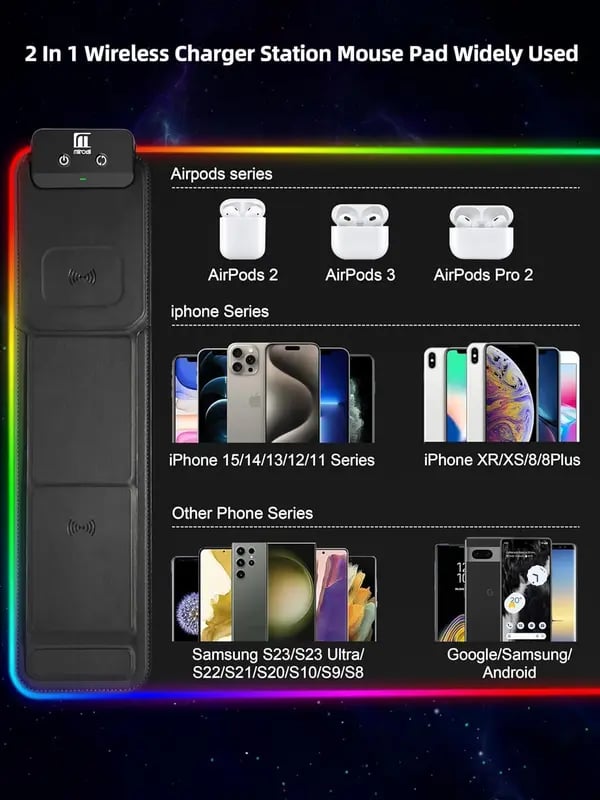 - Compatible with: iPhone 15/14/13/12/11/X/XR/XS/8 series; Samsung Galaxy S23/S22/S21/S20/S10/S9/S8/Note 9/8; AirPods 3rd/AirPods Pro 2nd/AirPods Pro, and other Qi-enabled devices.